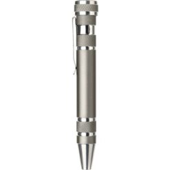 Śrubokręt w kształcie długopisu z 4 płaskimi i 4 krzyżakowymi końcówkami, posiada klip umożliwiający przypinanie, produkt wykonany z aluminium i stali