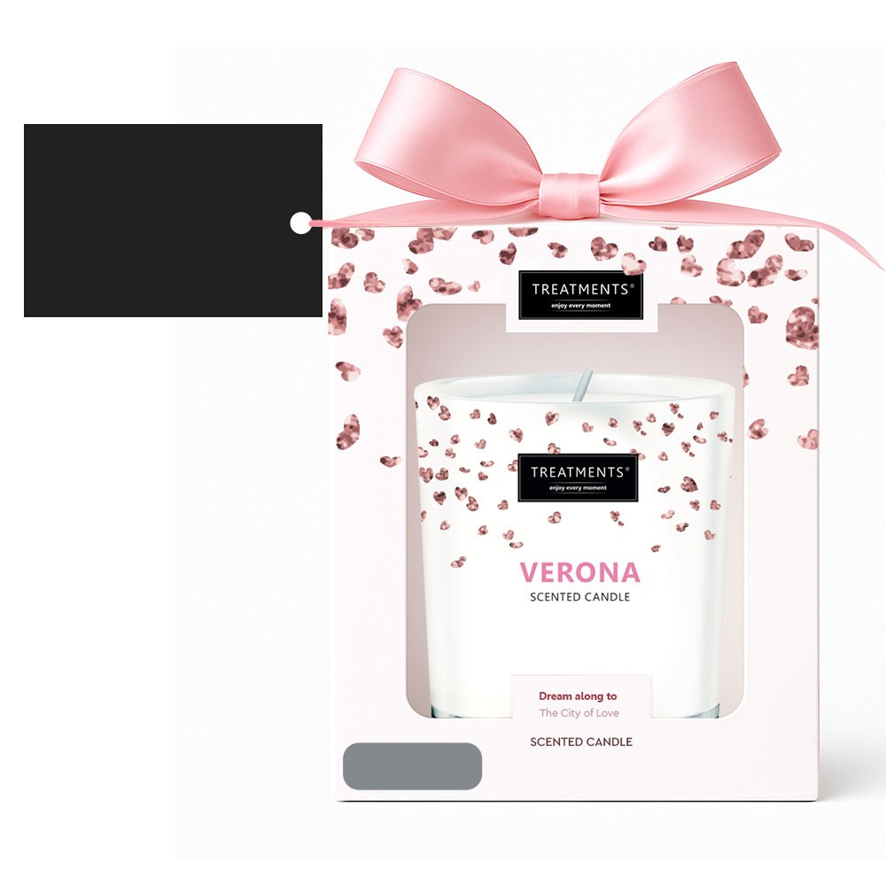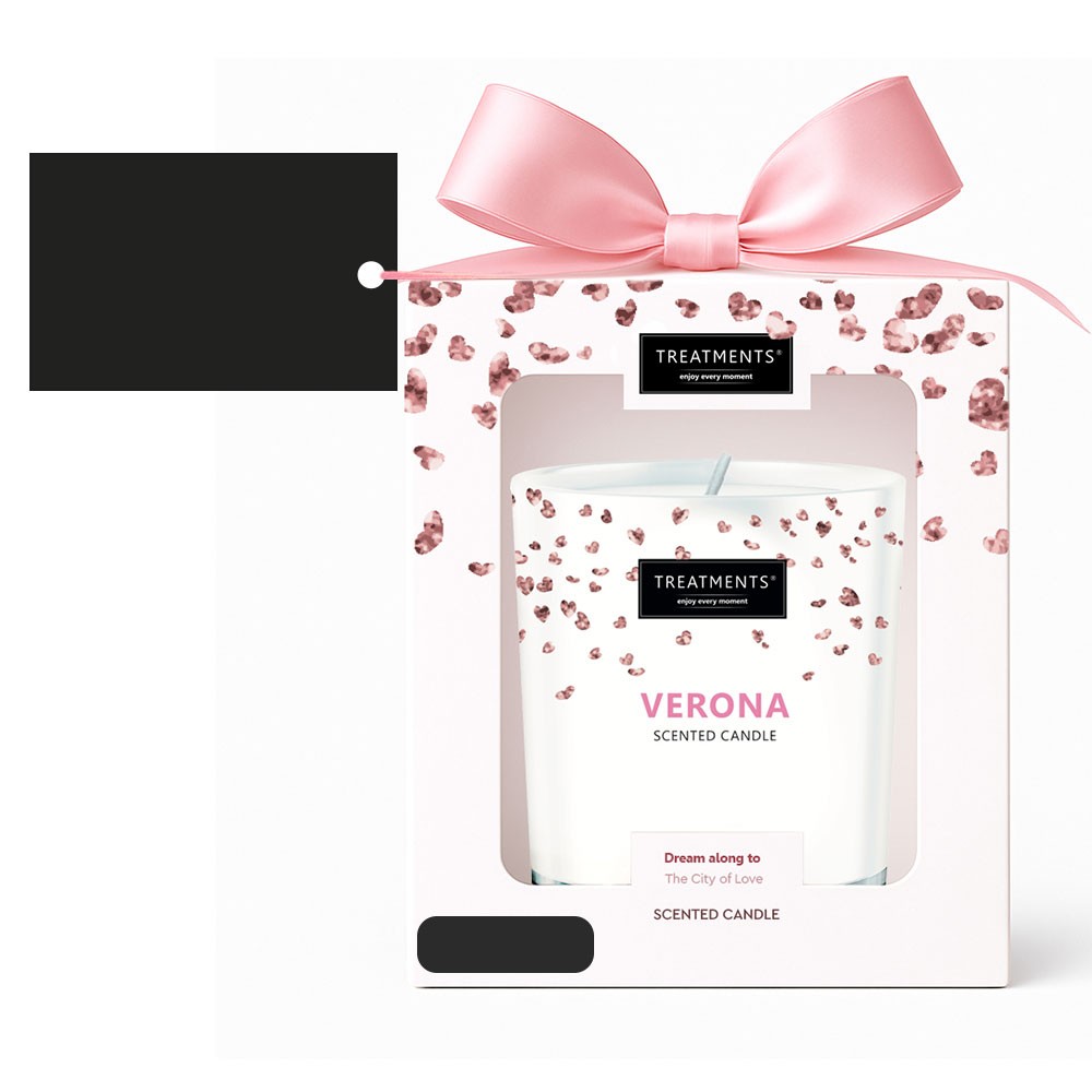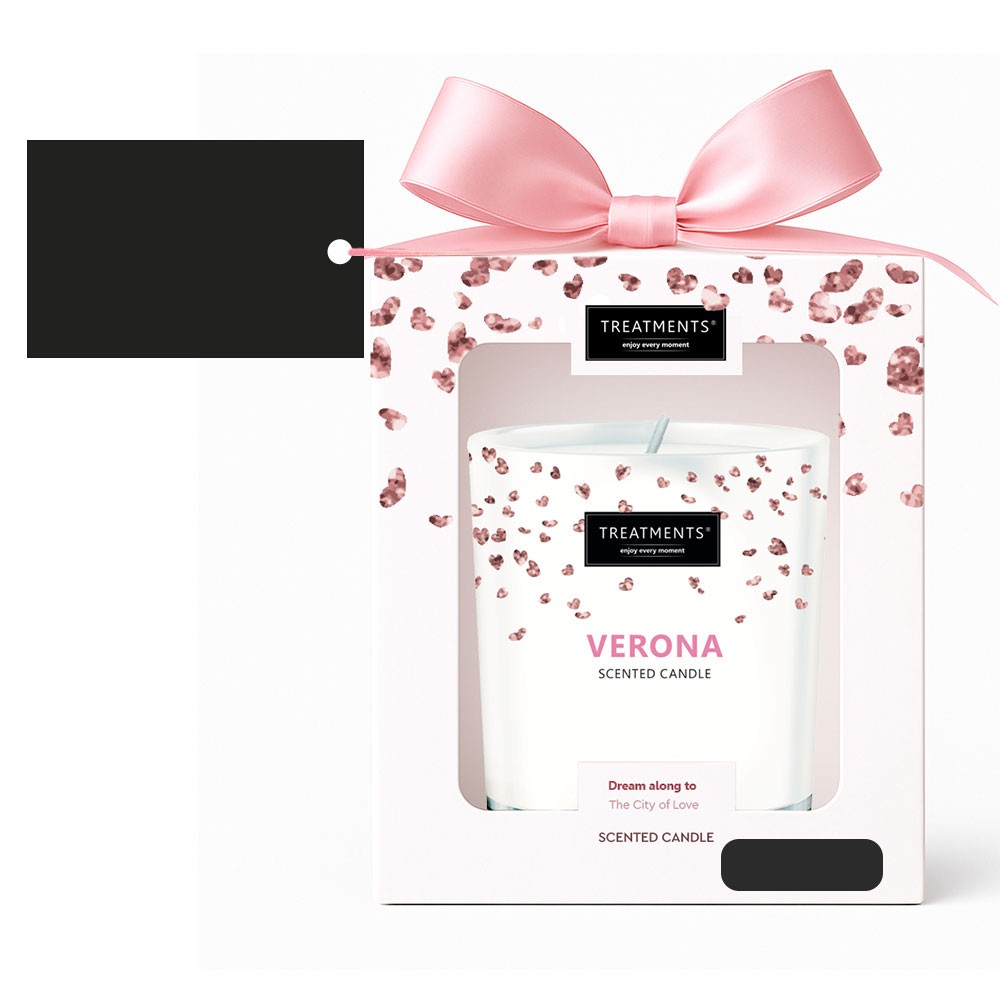 Świeczka zapachowa TREATMENTS, 380 g, zapakowana w elegancki kartonik, świeczka wypełni wnętrze domu ciepłem i niepowtarzalnym zapachem, dostępne różne warianty zapachowe: 03 – Ceylon (połączenie zapachów starożytnego Cejlonu z kwiatem owoców i jaśminem), 06 – Mahayana (aromat hiacyntów oraz korzenne nuty piżma i drzewa sandałowego), 08 – Omani (oddaje klimat Omanu – jego plaż, bezkresnych pustyń oraz drzewa sandałowego), 11 – Uyuni (lawenda, irys i drzewne nuty, które przenoszą w atmosferę Salar de Uyuni), 16 – Zhejiang (połączenie zapachu kaszmeranu z wanilią bourbon i jaśminem), 19 – Shinshiro (fasola tonki uzupełniona słodkimi aromatami i wonią kwiatów ryżu), 21 – Verona (romantyczny kwiatowy zapach łączący jaśmin i piwonię), 98 – Samoa (rajski zapach Samoa wzbogacony słodkim piżmem). Znakowanie produktu jest możliwe tylko na srebrnej lub złotej folii z czarnym nadrukiem albo na czarnej apli ze srebrnym lub złotym nadrukiem.