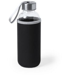 Szklana butelka 420 ml w pokrowcu | Bob z nadrukiem Twojego logo, materiał: szkło, stal nierdzewna, stal, kolor: czarny