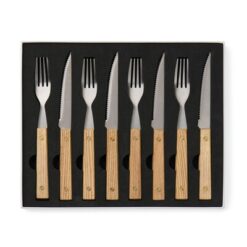 Zestaw 8 sztućców grillowych, design inspirowany skandynawską prostotą, wykonany ze stali nierdzewnej oraz drewna jesionowego z certyfikatem FSC®, 4 ostre noże oraz 4 widelce z wygodnym uchwytem