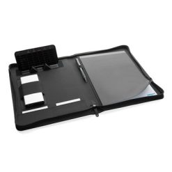 Teczka konferencyjna A4 z notatnikiem (20 kartek z 64 g/m2 papieru z recyklingu w linie), zamykana na zamek błyskawiczny, wewnątrz kieszeń i stojak na telefon, 2 kieszenie na wizytówki i pętla na akcesoria do pisania, wykonana z 8 poddanych recyklingowi butelek PET (500 ml), dzięki zastosowaniu technologii AWARE™ wykorzystane materiały są identyfikowalne z pochodzenia, 2% wpływów z każdego sprzedanego produktu z kolekcji Impact jest przekazywane na rzecz Water.org, nie zawiera PVC