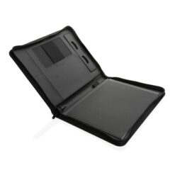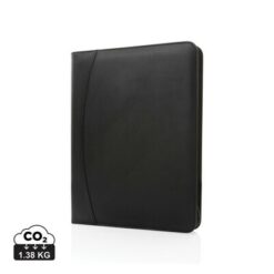 Teczka konferencyjna A4 z notatnikiem (20 kartek z 64 g/m2 papieru z recyklingu w linie), zamykana na zamek błyskawiczny, wewnątrz kieszeń i stojak na telefon, 2 kieszenie na wizytówki i pętla na akcesoria do pisania, wykonana w 100% z PU z recyklingu z certyfikatem RCS (Recycled Claim Standard) który gwarantuje, że wykorzystane materiały pochodzą z recyklingu, całkowita zawartość materiału z recyklingu obliczona w oparciu o wagę całkowitą przedmiotu: 14%, nie zawiera PVC
