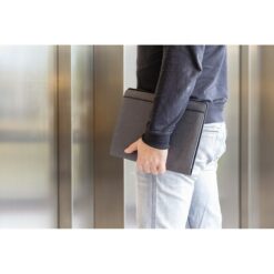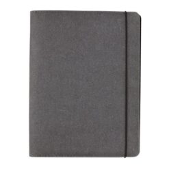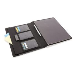 Teczka konferencyjna A4 z notatnikiem (20 kremowych kartek 64 g/m2 z papieru z recyklingu w linie), okładka wykonana ze skóry pochodzącej z recyklingu, wewnątrz 1 duża kieszeń, 3 kieszenie w rozmiarze telefonu, miejsce na 4 wizytówki, ślad węglowy produktu: 2,06 kg CO2