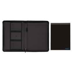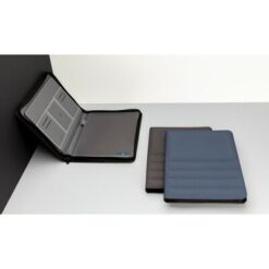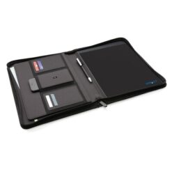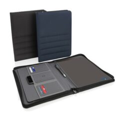 Teczka konferencyjna A4 z notatnikiem (20 kremowych kartek 80 g/m2 z papieru z recyklingu w linie), zamykana na zamek błyskawiczny, wewnątrz duża kieszeń, kieszeń na telefon oraz 2 dodatkowe kieszenie, 4 miejsca na karty kredytowe i pętla na akcesoria do pisania, tkanina zewnętrzna i wewnętrzna z poliestru AWARE™ RPET, który został wykonany z butelek PET pochodzących z recyklingu z identyfikowalnym źródłem, produkt został wykonany z 10 butelek plastikowych poddanych recyklingowi, 2% zysku ze sprzedaży każdego jest przekazywane do fundacji Water.org, w ozdobnym, kraftowym pudełku