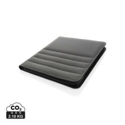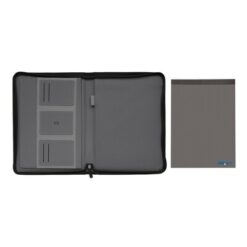 Teczka konferencyjna A4 z notatnikiem (20 kremowych kartek 80 g/m2 z papieru z recyklingu w linie), zamykana na zamek błyskawiczny, wewnątrz duża kieszeń, kieszeń na telefon oraz 2 dodatkowe kieszenie, 4 miejsca na karty kredytowe i pętla na akcesoria do pisania, tkanina zewnętrzna i wewnętrzna z poliestru AWARE™ RPET, który został wykonany z butelek PET pochodzących z recyklingu z identyfikowalnym źródłem, produkt został wykonany z 10 butelek plastikowych poddanych recyklingowi, 2% zysku ze sprzedaży każdego jest przekazywane do fundacji Water.org, w ozdobnym, kraftowym pudełku