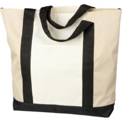 Torba na zakupy, posiada długie uchwyty umożliwiające noszenie na ramieniu, duża przegroda zapinana na zamek, otwarta kieszeń przednia, produkt wykonany z RPET