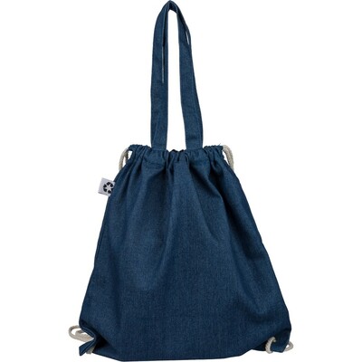 Torba na zakupy, worek ze sznurkiem, posiada długie uchwyty umożliwiające noszenie na ramieniu (2,5 x 50 cm), ikona recyklingu, produkt wykonany z dżinsu z recyklingu