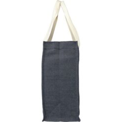 Torba na zakupy z denimu, długie płócienne uchwyty (długość 120 cm, szerokość 35 mm i grubość 2 mm – 280 g/m²), guzik do zamykania torby, produkt wykonany z denimu, poliestru i bawełny