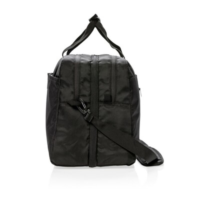 Torba sportowa, podróżna z kieszenią na laptopa 15,6″, ochrona RFID, hybrydowa konstrukcja zapewniająca łatwe przenoszenie, wygodny system otwierania i organizowania rzeczy jak walizka, zamykana na zamek błyskawiczny z dostępem do podwójnej przegrody, z tyłu kieszeń na prasę oraz zamykana na zamek kieszeń z ochroną RFID i łatwym dostępem, z przodu 2 duże kieszenie na zamek błyskawiczny, nie zawiera PVC, ślad węglowy produktu: 10,05 kg CO2