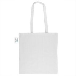 Torba na zakupy B’RIGHT, posiada długie uchwyty umożliwiające noszenie na ramieniu, produkt wykonany z bawełny z recyklingu o gramaturze 200 g/m² i poliestru z recyklingu, zgodna z certyfikatem GRS (Global RecycIed Standard)