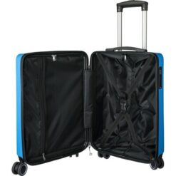 Walizka, torba na kółkach z twardą obudową, 8 kółek obrotowych (4×2), trzypoziomowy metalowy uchwyt, górny uchwyt z tworzywa sztucznego, zamek szyfrowy (nie-TSA), tabliczka do grawerowania z taśmą 3M, posiada trzy przegrody: kieszeń na suwak w kształcie litery U, kieszeń z siatki oraz pasy krzyżowe z klamrą, pojemność: 30L, pakowana pojedynczo w brązowe kartonowe pudełko, produkt wykonany z ABS, wnętrze wyłożone materiałem 210D