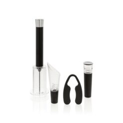 Zestaw akcesoriów do wina 4 el.: ciśnieniowy korkociąg, nóż do folii, korek z pompką próżniową, nalewak z aeratorem, w eleganckiej tubie upominkowej, ślad węglowy produktu: 0,98 kg CO2