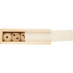 Zestaw do gry w kości, zawiera 5 kości oraz pudełko, zapakowany pojedynczo w brązowe kartonowe pudełko, produkt wykonany z drewna bukowego