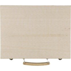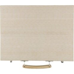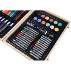 Zestaw do rysowania ze sklejki w sosnowej skrzynce z drewnianą rączką, zawierający 66 elementów: 12 kredek woskowych, 12 kredek ołówkowych (naostrzonych), 12 pisaków, 12 pasteli olejnych, klej w sztyfcie, gumkę do ścierania, temperówkę, linijkę, pędzel, 12 farb, paletę, pakowany pojedynczo w brązowe kartonowe pudełko
