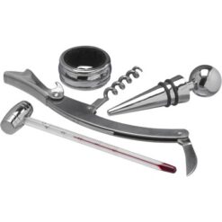 Zestaw do wina 4 el. w pudełku, akcesoria do wina: nóż kelnerski, pierścień na butelkę, zatyczka, termometr
