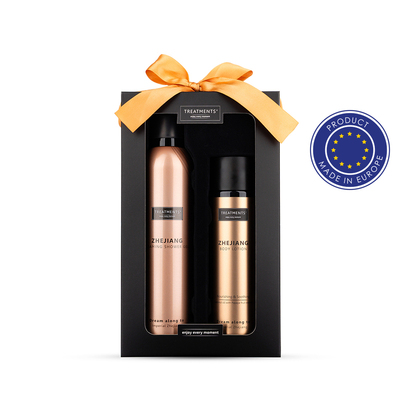 Zestaw kosmetyków Tenderness TREATMENTS, w zestawie znajduje się: pieniący się żel pod prysznic 200 ml, balsam do ciała 250 ml, elegancki, papierowy kartonik, w którym zapakowane są kosmetyki, sprawdzą się w codziennej pielęgnacji, dostępne są różne warianty zapachowe: 03 – Ceylon, 06 – Mahayana, 08 – Omani, 11 – Uyuni, 16 – Zhejinag, 19 – Shinshiro, 21 – Verona, 98 – Samoa. Znakowanie produktu jest możliwe tylko na srebrnej lub złotej folii z czarnym nadrukiem albo na czarnej apli ze srebrnym lub złotym nadrukiem.