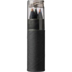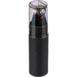 Zestaw 6 kredek z ozdobnym czarnym trzonem, w okrągłym pudełku zamykanym zatyczką z wbudowaną temperówką, dzięki której łatwiej je przechowywać i trudniej uszkodzić, produkt wykonany z kartonu z recyklingu i ABS