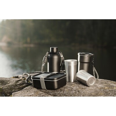 Zestaw kubków podróżnych 5 w 1, w komplecie kubek 450 ml oraz cztery kubki 250 ml, które mieszczą się wewnątrz dużego kubka, duży kubek posiada odpinany pasek do noszenia, wykonane ze stali nierdzewnej z recyklingu, całkowita zawartość materiałów z recyklingu obliczona na podstawie masy całkowitej produktu: 71%