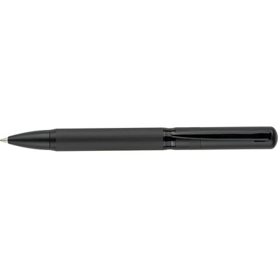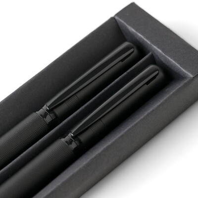 Zestaw piśmienniczy, zawiera długopis z niebieskim tuszem ok. 1000 m pisania, pióro kulkowe ok. 400 m pisania, zapakowany w czarny kartonik, produkt wykonany z metalu,