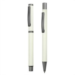 Zestaw piśmienniczy, długopis oraz pióro kulkowe z kolorowym trzonem i szarymi elementami, długopis klikany, piórko kulkowe ze skuwką, posiadają gumowe wykończenie, wkłady w niebieskim kolorze, dopasowane kolorystycznie pudełko podarunkowe w komplecie, produkt wykonany z aluminium i plastiku