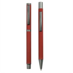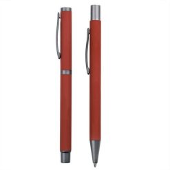 Zestaw piśmienniczy, długopis oraz pióro kulkowe z kolorowym trzonem i szarymi elementami, długopis klikany, piórko kulkowe ze skuwką, posiadają gumowe wykończenie, wkłady w niebieskim kolorze, dopasowane kolorystycznie pudełko podarunkowe w komplecie, produkt wykonany z aluminium i plastiku