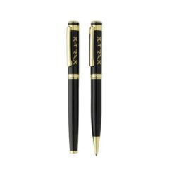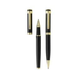 Ekskluzywny zestaw piśmienny, pióro żelowe oraz długopis z logotypem Swiss Peak wykonane z mosiądzu z recyklingu z certyfikatem RCS, akcenty w kolorze złotym, niebieski wkład, długość pisania długopisu ok. 1200 m, długość pisania pióra ok. 800 m, pudełko podarunkowe w komplecie, całkowita zawartość materiałów z recyklingu obliczona w oparciu o wagę całkowitą przedmiotu: 55%