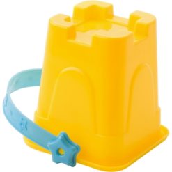Wiaderko plażowe w 4 różnych kolorach i kształtach – 2 okrągłe, 1 kwadrat, 1 ośmiobok, wewnątrz znajdują się: łopatka, grabki, sitko, szufelka i 2 foremki do piasku (krab i ryba), mix 4 wzorów