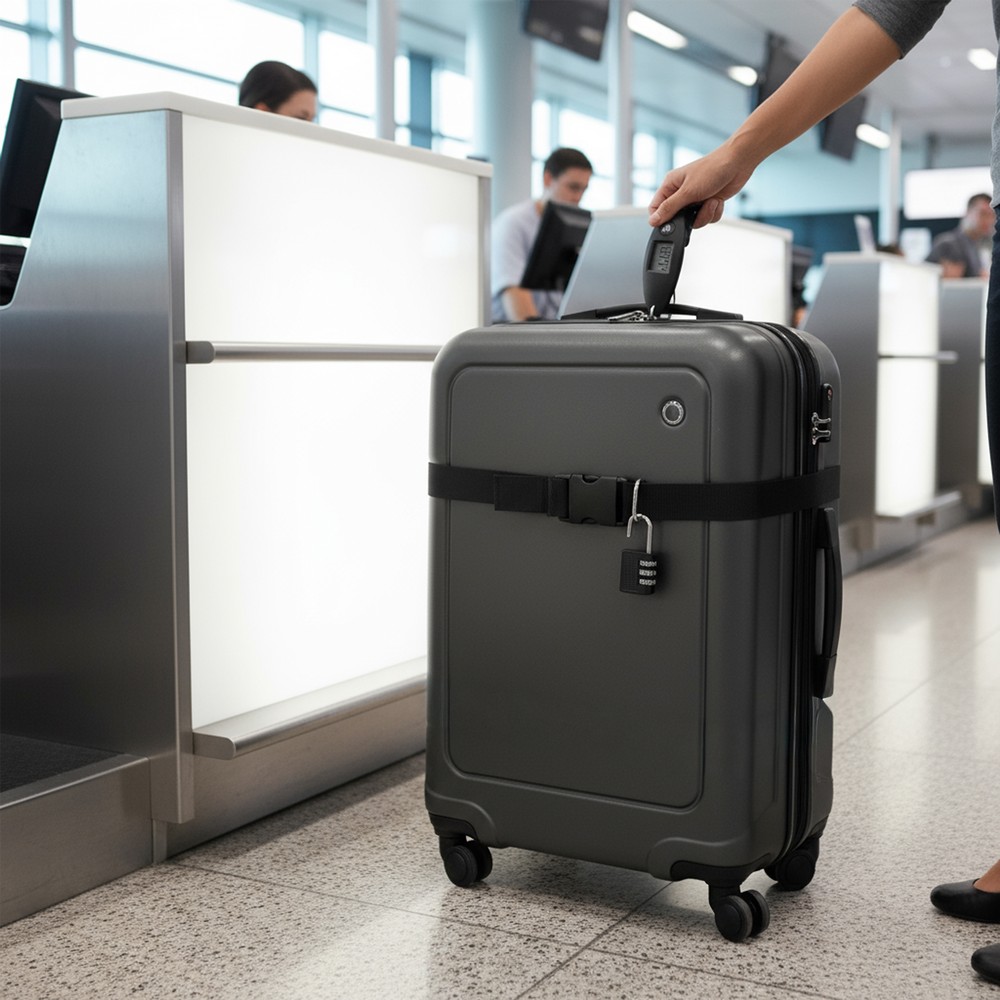 Zestaw podróżny Mauro Conti, wewnątrz cyfrowa waga do bagażu z przyciskiem on/off i paskiem na rękę (maksymalne obciążenie 40 kg, minimalne 1 kg), pas do walizki oraz kłódka podróżna, w ozdobnym pudełku