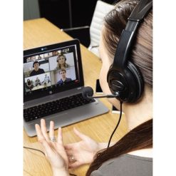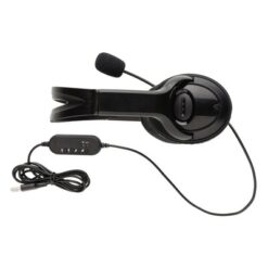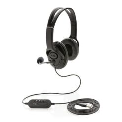 Zestaw słuchawkowy, wykonany z ABS, lekki i wygodny, wbudowany mikrofon, wbudowany panel do zmiany głośności / wyciszenia, nadają się idealnie do rozmów video, kompatybilne z komputerami PC oraz Mac®, zintegrowany kabel z końcówką USB A o długości 2 m, ślad węglowy produktu: 1,37 kg CO2