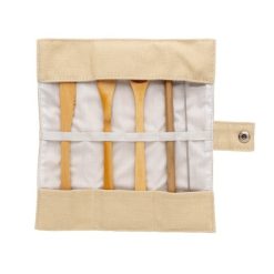 Zestaw 4 bambusowych sztućców wielokrotnego użytku: łyżka, widelec, nóż, słomka, materiałowy pokrowiec i czyścik w komplecie, ślad węglowy produktu: 0,61 kg CO2