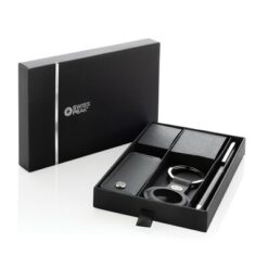 Zestaw upominkowy, brelok z miejscem na lokalizator AirTag, organizer do kluczy, długopis, brelok i organizer wykonane z PU z recyklingu, długopis wykonany z aluminium z recyklingu z certyfikatem RCS, całkowita zawartość materiałów z recyklingu obliczona w oparciu o wagę całkowitą przedmiotu: brelok 7%, długopis 8%, w pudełku upominkowym