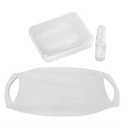 Zestaw w pudełku, pojemnik na płyn do dezynfekcji, maseczka wielokrotnego użytku z miejscem na filtr i jonami srebra z nadrukiem Twojego logo, materiał: pp, pet, poliamid, kolor: biały