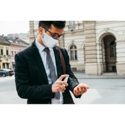 Zestaw w przezroczystym pudełku, butelka 15 ml na płyn do dezynfekcji, maseczka wielokrotnego użytku z jonami srebra, niemedyczna, posiada miejsce na filtr, wykonana w 100% z poliamidu 250 g/m2, jony srebra utrzymują się do 20 prań, temperatura prania do 90 stopni Celsjusza, wyprodukowana w Polsce