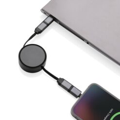 Zwijany kabel do ładowania i synchronizacji, końcówki: USB, 2 x USB typu C i 2 w 1 (micro USB i iOS), moc ładowania do 45W, wykonany z materiałów z recyklingu, całkowita zawartość materiałów obliczona na podstawie wagi całkowitej przedmiotu: 96%, ślad węglowy produktu: 0,27 kg CO2