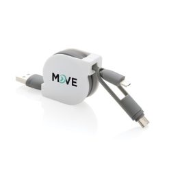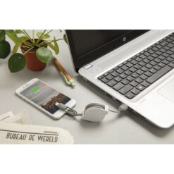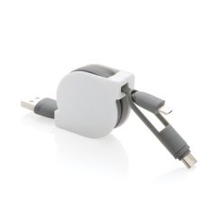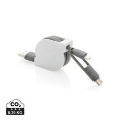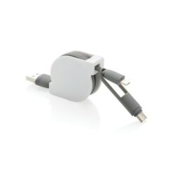 Zwijany, płaski kabel do ładowania i synchronizacji 3 w 1 z końcówkami: USB, typu C i 2 w 1 (micro USB oraz kompatybilną z urządzeniami iOS), obudowa wykonana z ABS, kabel z TPU, długość po rozwinięciu 1 m, ślad węglowy produktu: 0,29 kg CO2