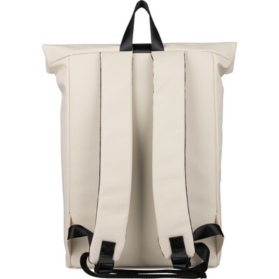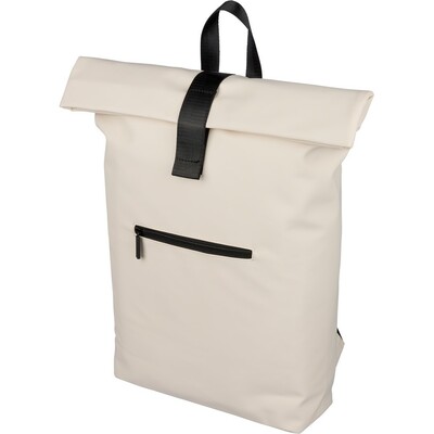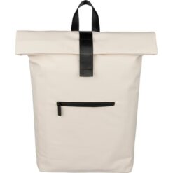 Zwijany plecak o pojemności 19 litrów, mała kieszeń zapinana na zamek z przodu, zwijana główna kieszeń zamykana na rzep, przegroda na laptopa 16″ w środku, regulowane wentylowane paski na ramię, uchwyt z wierzchu ułatwiający noszenie, podszewka z poliestru 210D, ikona recyklingu na metce, produkt wykonany z PU z recyklingu i poliestru