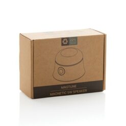Głośnik bezprzewodowy 5W, BT 5.0, magnes w podstawie umożliwia przyczepienie telefonu do metalicznych powierzchni jak telefon, czy lodówka, wykonany z ABS z recyklingu z certyfikatem RCS, wbudowany akumulator o pojemności 650 mAh pozwala na odtwarzanie muzyki do 5 godzin, ponowne ładowanie w 2 godziny, kabel z TPE z recyklingu w komplecie, całkowita zawartość materiałów z recyklingu obliczona w oparciu o wagę całkowitą przedmiotu: 22%, w pudełku z certyfikatem FSC® mix