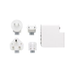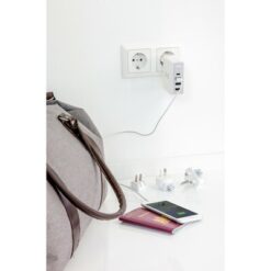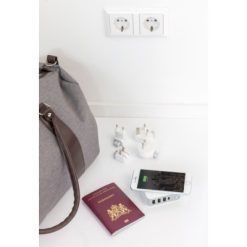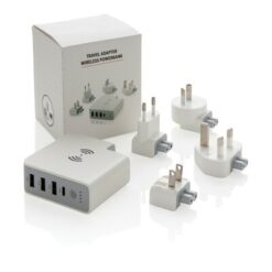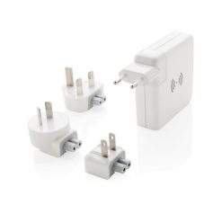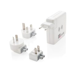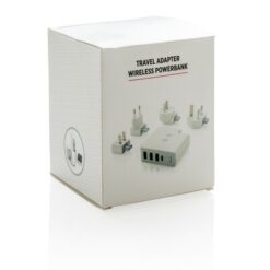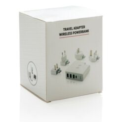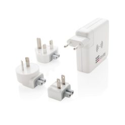 Adapter podróżny, bezprzewodowy power bank 6700 mAh, ładowarka bezprzewodowa 5W, bezprzewodowe ładowanie jest kompatybilne ze wszystkimi urządzeniami posiadającymi możliwość ładowania indukcyjnego, adapter wyposażony jest w 4 wymienne wtyczki: UE, UK, USA i Australii, urządzenie posiada 3 gniazda USB i 1 USB typu C o łącznej mocy 4.2A, w pełni naładowane urządzenie może naładować telefon do 3 razy, ładowanie power banku rozpoczyna się automatycznie po podłączeniu urządzenia do gniazda sieciowego, wejście AC 100-240V 50/60Hz, wyjście 5V/4.2A, wyjście bezprzewodowe 5V/1A 5W, etui z mikrofibry w komplecie
