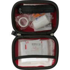 Apteczka w pokrowcu, 16 el., w tym: 1 sterylna chusteczka z non-woven, 1 bandaż w rolce, 1 trójkątny bandaż, 2 agrafki, nożyczki, 4 chusteczki nasączone alkoholem, 5 plastrów i 1 rolka taśmy