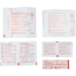Apteczka, zapięcie na rzep, pasek ułatwiający noszenie, kieszenie wewnętrzne, ikona RPET na metce, plastry (5 szt.), jałowy opatrunek, gąbka, gaziki nasączone alkoholem (8 szt.), wilgotne chusteczki (2 szt.), produkt wykonany z PE, PVC, PU i RPET 600D