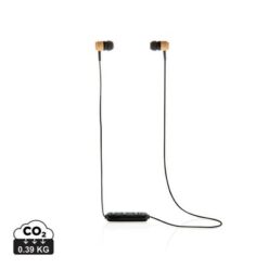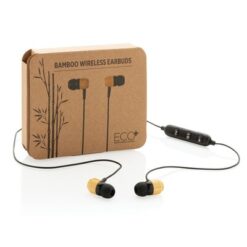 Słuchawki bezprzewodowe BT 5.0, douszne, wykonane z bambusa, magnetyczne końcówki, wbudowany akumulator 55 mAh umożliwia odtwarzanie muzyki do 3 godzin, ponowne naładowanie w 1 godzinę, zasięg do 10 m, nakładki w 3 rozmiarach i ekologiczne etui w komplecie