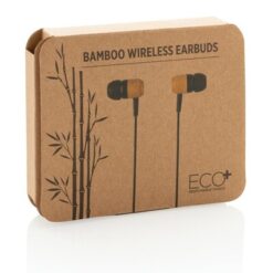 Bambusowe bezprzewodowe słuchawki douszne z nadrukiem Twojego logo, materiał: plastik, bambus, kolor: czarny