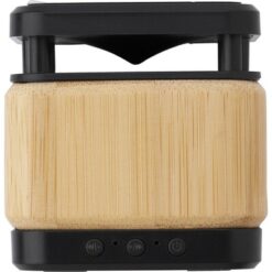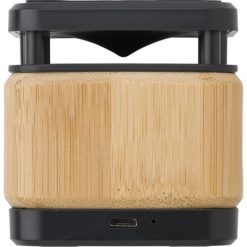 Głośnik bezprzewodowy BT 5.0 3W, zasięg do 10 m, ładowarka bezprzewodowa 3W, działa z telefonami posiadającymi możliwość ładowania indukcyjnego, bambusowa obudowa, wejście 5V/1.5A, wyjście bezprzewodowe 5V/0.8A, bateria 400 mAh, antypoślizgowy spód i góra, ładowany przez USB, kabel micro USB w komplecie