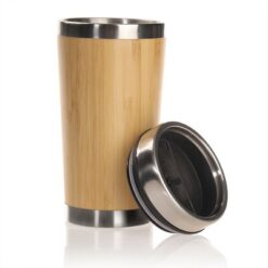 Kubek termiczny 500 ml z plastikowym wieczkiem, posiada podwójne ścianki, które spowalniają oddawanie temperatury na zewnątrz, bambusowe elementy na zewnątrz oraz wnętrze ze stali nierdzewnej, utrzymuje temperaturę napojów gorących do 4 godzin