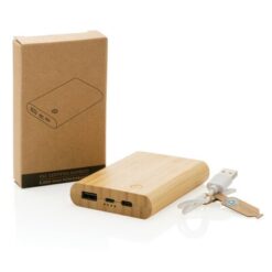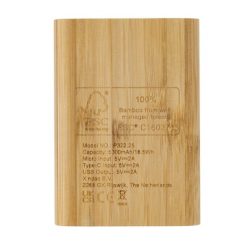 Power bank 5000 mAh, 4 diody wskazujące poziom naładowania, obudowa wykonana z bambusa z certyfikatem FSC® (Forest Stewardship Council), wbudowany akumulator litowo-polimerowy klasy A, wejścia micro USB i USB typu C 5V/2A, wyjścia USB i USB typu C 5V/2A, kabel z TPE z recyklingu bez dodatku PVC w komplecie, w pudełku z certyfikatem FSC® mix, nie zawiera PVC, ślad węglowy produktu: 2,38 kg CO2