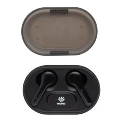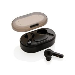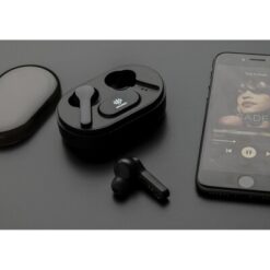 Bezprzewodowe słuchawki douszne TWS (True Wireless Stereo), BT 5.0, funkcja odbierania połączeń, muzyka oraz rozmowy telefoniczne stereo, etui z wbudowanym akumulatorem 300 mAh pełniące funkcję stacji ładującej w komplecie, grawer na stacji ładującej ukazuje podświetlaną powierzchnię, akumulator słuchawek umożliwia odtwarzanie muzyki do 3 godzin, ponowne naładowanie za pomocą etui w 1,5 godziny, zasięg do 10 metrów, 3 rozmiary nakładek dousznych w komplecie, kabel micro USB wykonany z TPE bez dodatku PVC w komplecie, ślad węglowy produktu: 0,74 kg CO2