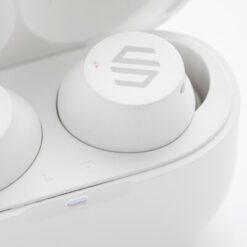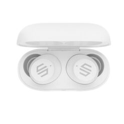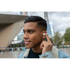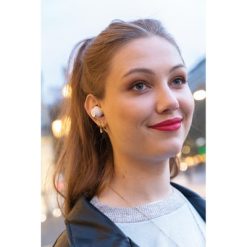 Bezprzewodowe słuchawki douszne, mocny i głęboki dźwięk, poziom redukcji szumów do 25 dB, wodoodporne IPX5 (całkowita ochrona przed strumieniem wody płynącej z różnych kierunków z wydajnością do 12,5 litra na minutę), dotykowy panel sterowania, wbudowany mikrofon, funkcja odbierania połączeń, do 5 godzin odtwarzania na jednym ładowaniu, etui ładujące zapewnia 18 godzin odtwarzania, nie zawiera PVC, opakowanie nie zawiera plastiku, ślad węglowy produktu: 1,02 kg CO2