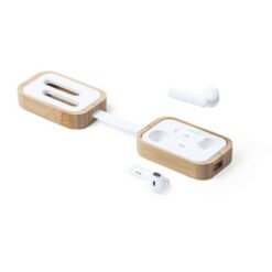 Słuchawki bezprzewodowe BT 5.0 w bambusowym magnetycznym etui ładującym, douszne, bateria stacji ładującej 400 mAh, bateria słuchawek 35 mAh, czas pracy: ok. 2.5h, funkcja odbierania połączeń, wbudowany mikrofon, zasięg do 10 m, ładowane przez USB, kabel micro USB w komplecie