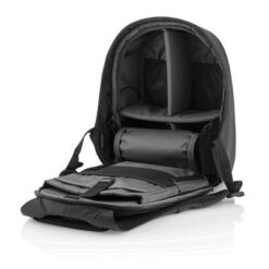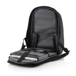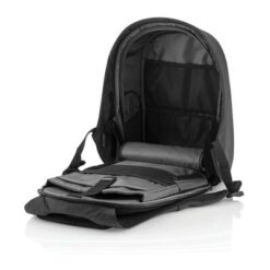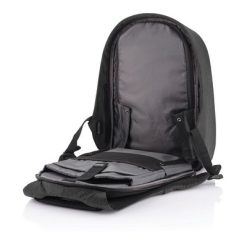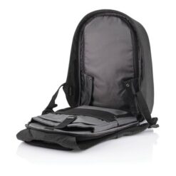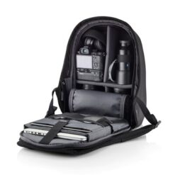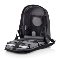 Plecak chroniący przed kieszonkowcami Bobby Hero XL, wodoodporny i odporny na przecięcia materiał, wykonany z przyjaznego środowisku materiału RPET, ukryte zamki i kieszenie, wewnątrz miękkie przegrody na laptopa do 17″ i tablet do 12,9″, zintegrowany port USB do ładowania telefonów (power-bank nie jest dołączony), odblaskowe paski zwiększające widoczność, pasek do zamocowania na walizce, wzór zastrzeżony®, ślad węglowy produktu: 7,57 kg CO2
