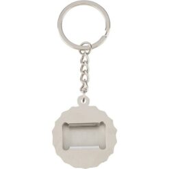 Brelok do kluczy w kształcie kapsla, otwieracz do butelek w kształcie kapsla, zapakowany w papierowy kartonik, produkt wykonany z metalu i bambusa
